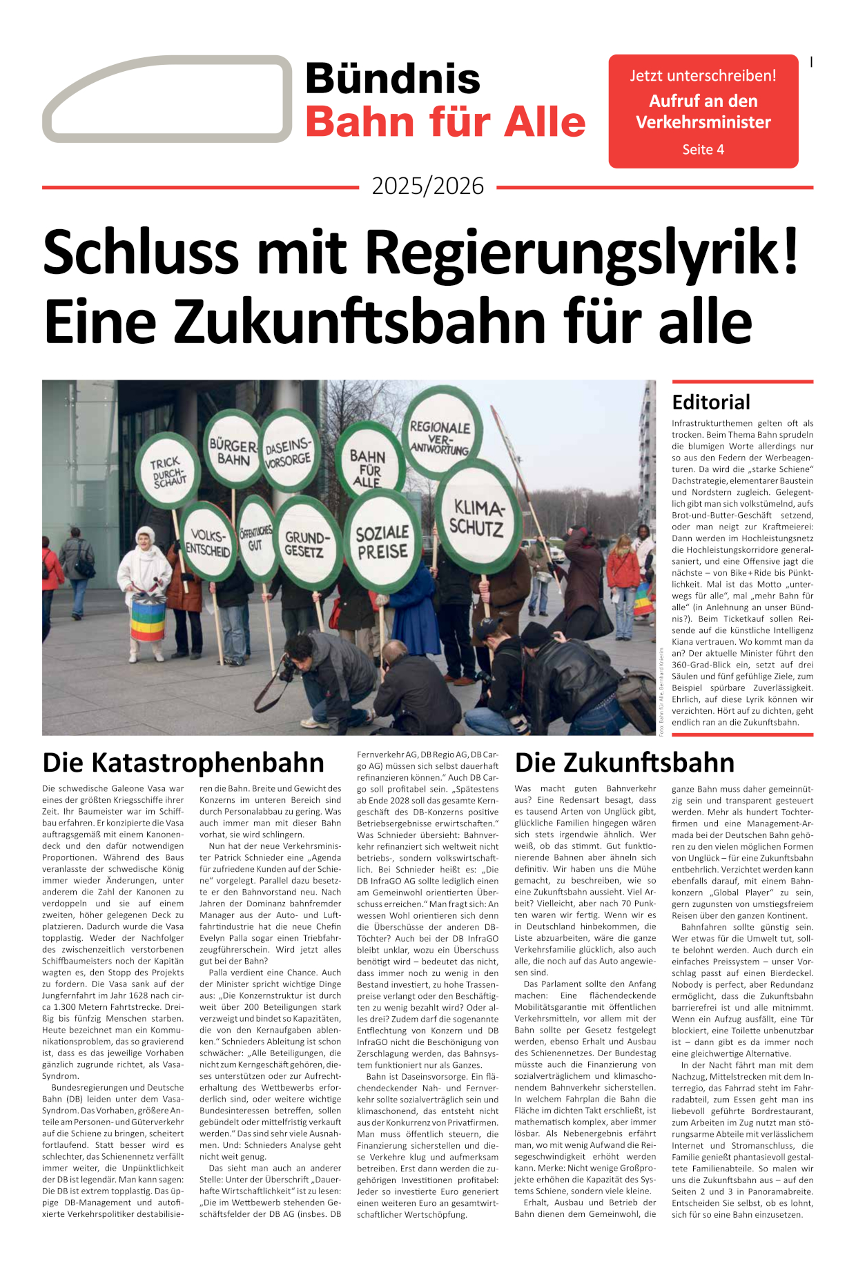 Am 16. Oktober 2025 veröffentlichte Bahn für Alle eine vierseitige Sonderzeitung. Darin stellen wir unter anderem eine Auswahl an Vorschlägen für die Zukunftsbahn vor. Es handelt sich um Auszüge aus unserem im September 2025 veröffentlichten Konzept „Eine Zukunftsbahn für alle“, das insgesamt 70 Vorschläge enthält. Aus dem Inhalt der Zeitung: Editorial | Die Katastrophenbahn | Die Zukunftsbahn | Illustrierte Panoramaseite „Eine Zukunftsbahn für alle“ | Aufruf an Bundesminister Patrick Schnieder: Anhörung zu einer großen Bahnreform | Interwiew mit Dr. Hendrik Sander: Wie bezahlen wir die Verkehrswende? | Unbeirrt auf Schienenkurs. 20 Jahre Bahn für Alle. || Hrsg. Bündnis Bahn für Alle, 2025, 4 Seiten, bundesweite Beilage in der taz am 16. Oktober 2025, im Freitag am 30. Oktober 2025, im nd.dieWoche am 7. November 2025 und in der jungen Welt (noch offen). Zusatzdruck im Berliner Zeitungsformat zum Verteilen bei Bahn für Alle (info@bahn-fuer-alle.de) bestellbar.